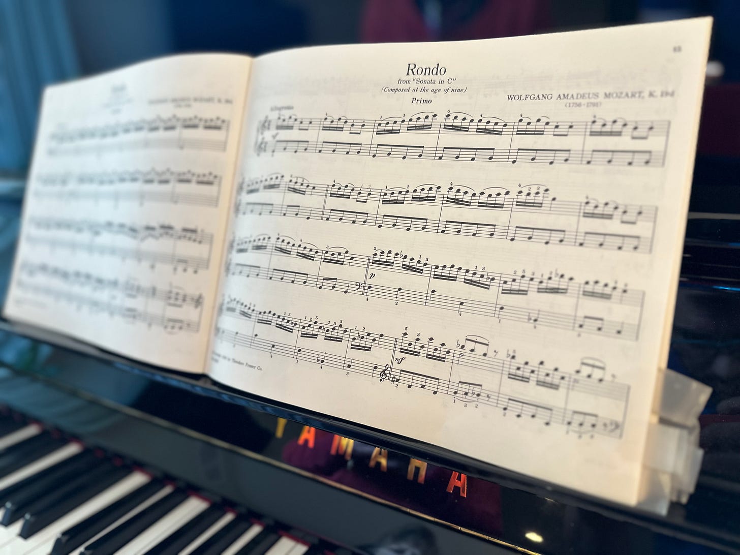 The way little Mozart wrote the piece, the primo person (in this case, me) putting her left hand over the other player’s right hand has to be careful and it doesn’t feel exactly natural, and every time I follow the notes and see that my left hand, in order to reach the “f” below middle C, even though there are no flats or sharps in this easy rondo, feels a bit awkward and that I could easily mess up my partner’s simple run of treble clef eighth notes if I am not careful.